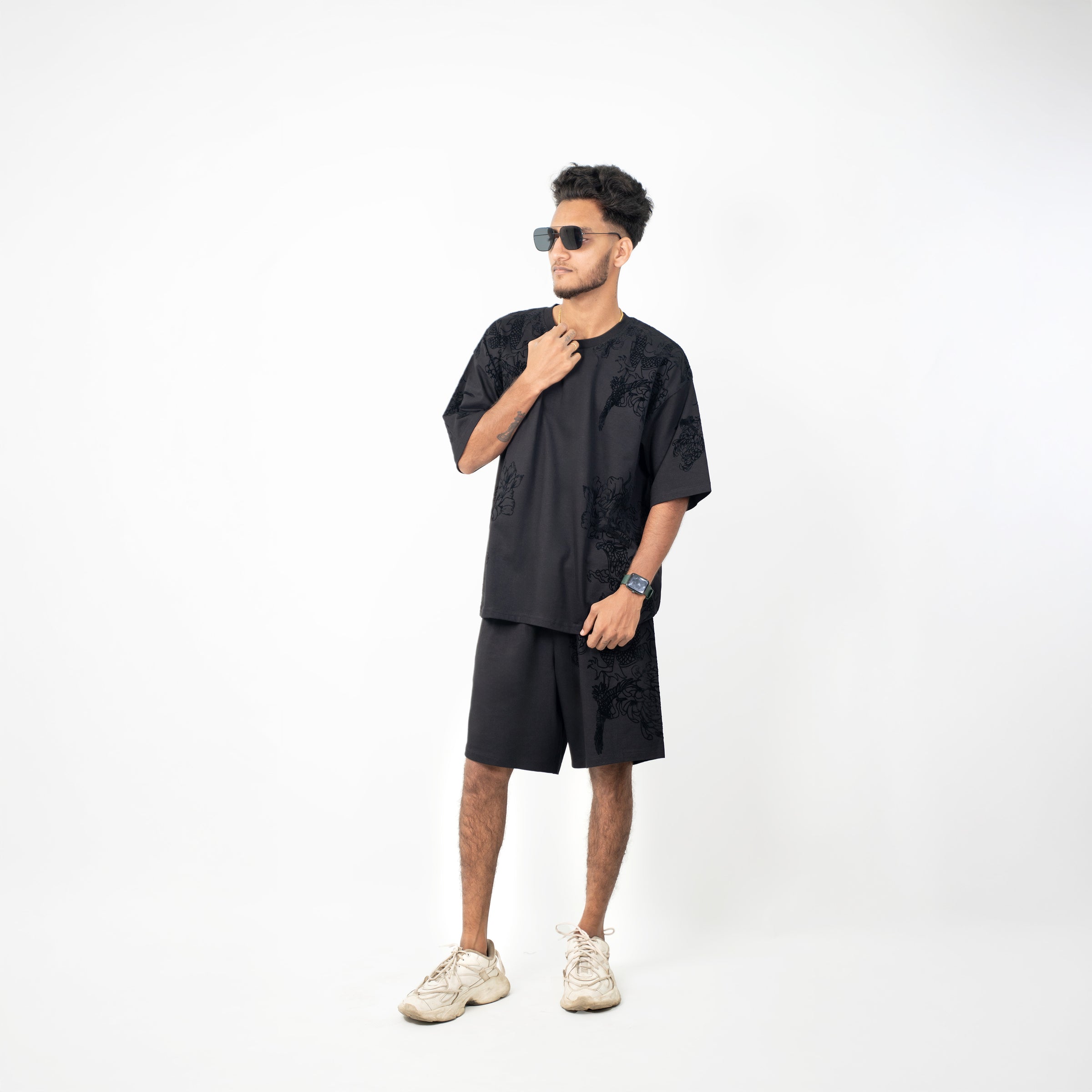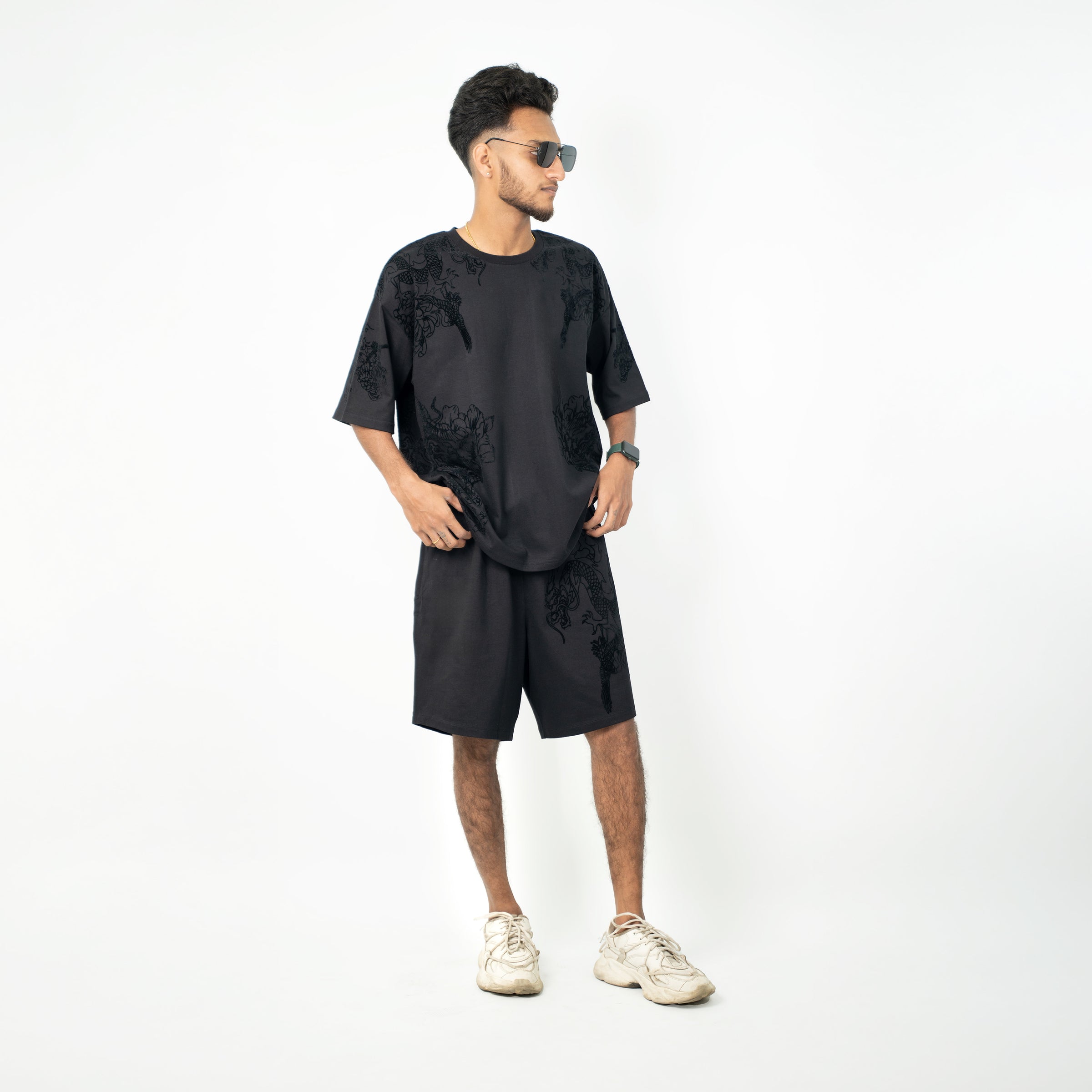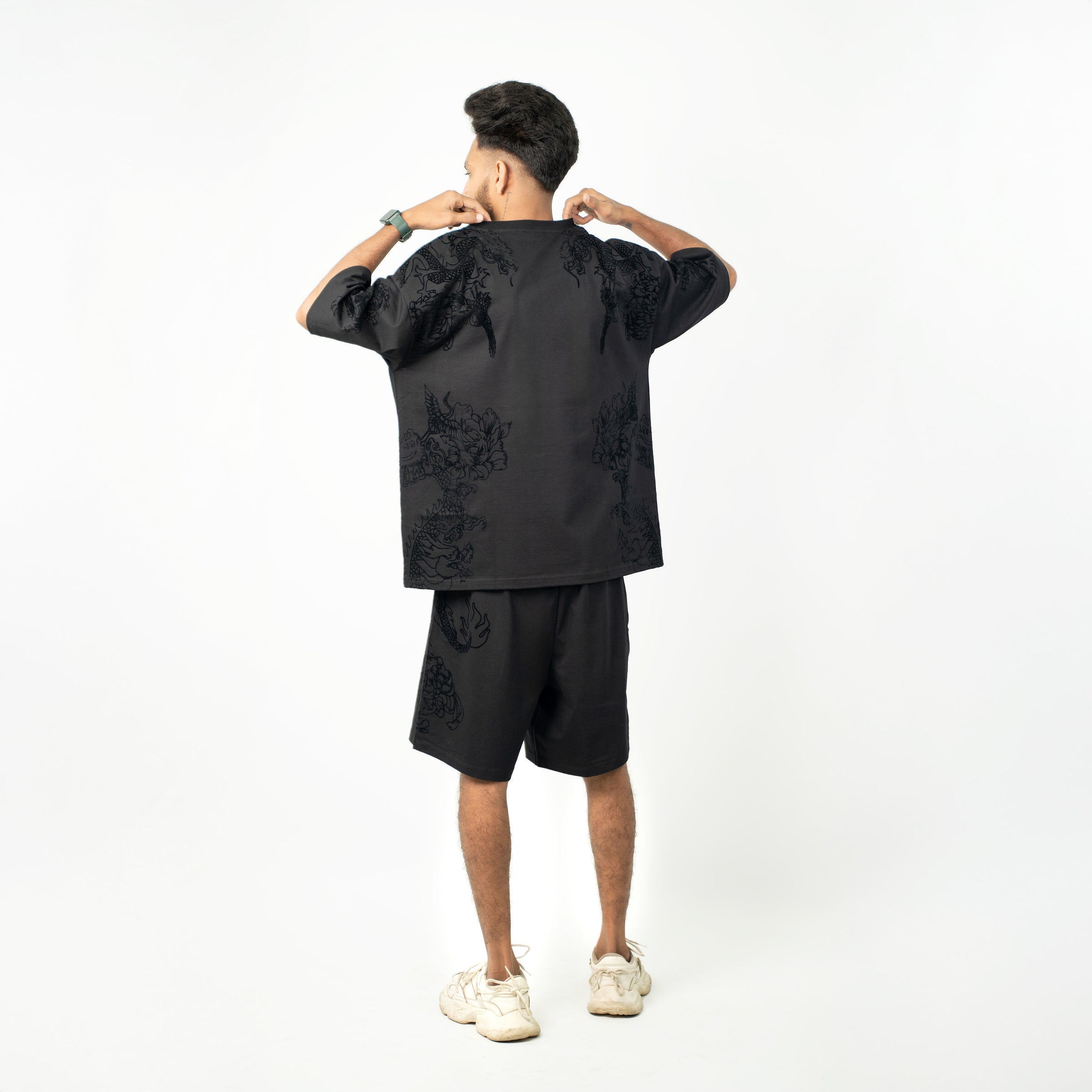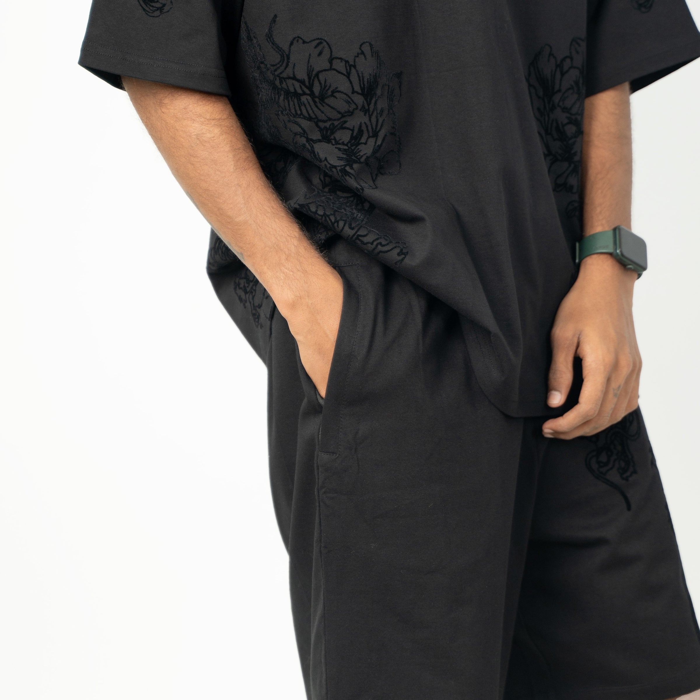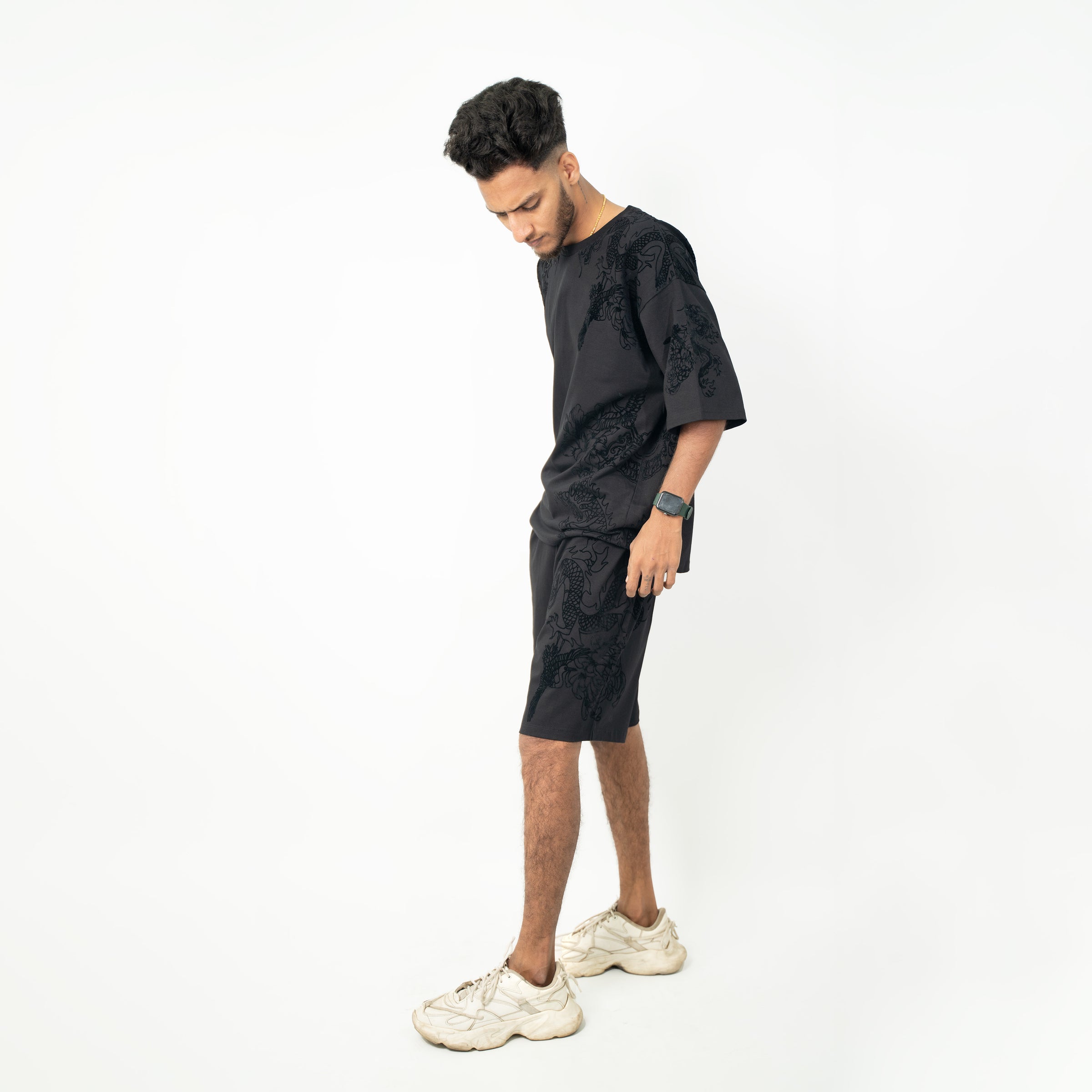 The men's dragon coord set is an essential addition to your wardrobe, especially for those who appreciate black attire. This stunning ensemble is made from 230 gsm pure cotton fabric and features shorts with a convenient zipper pocket. The dragon design boasts an elegant black-on-black flock print. With very limited availability, don’t miss your chance to own this unique piece—be one of the few who can say they have it!