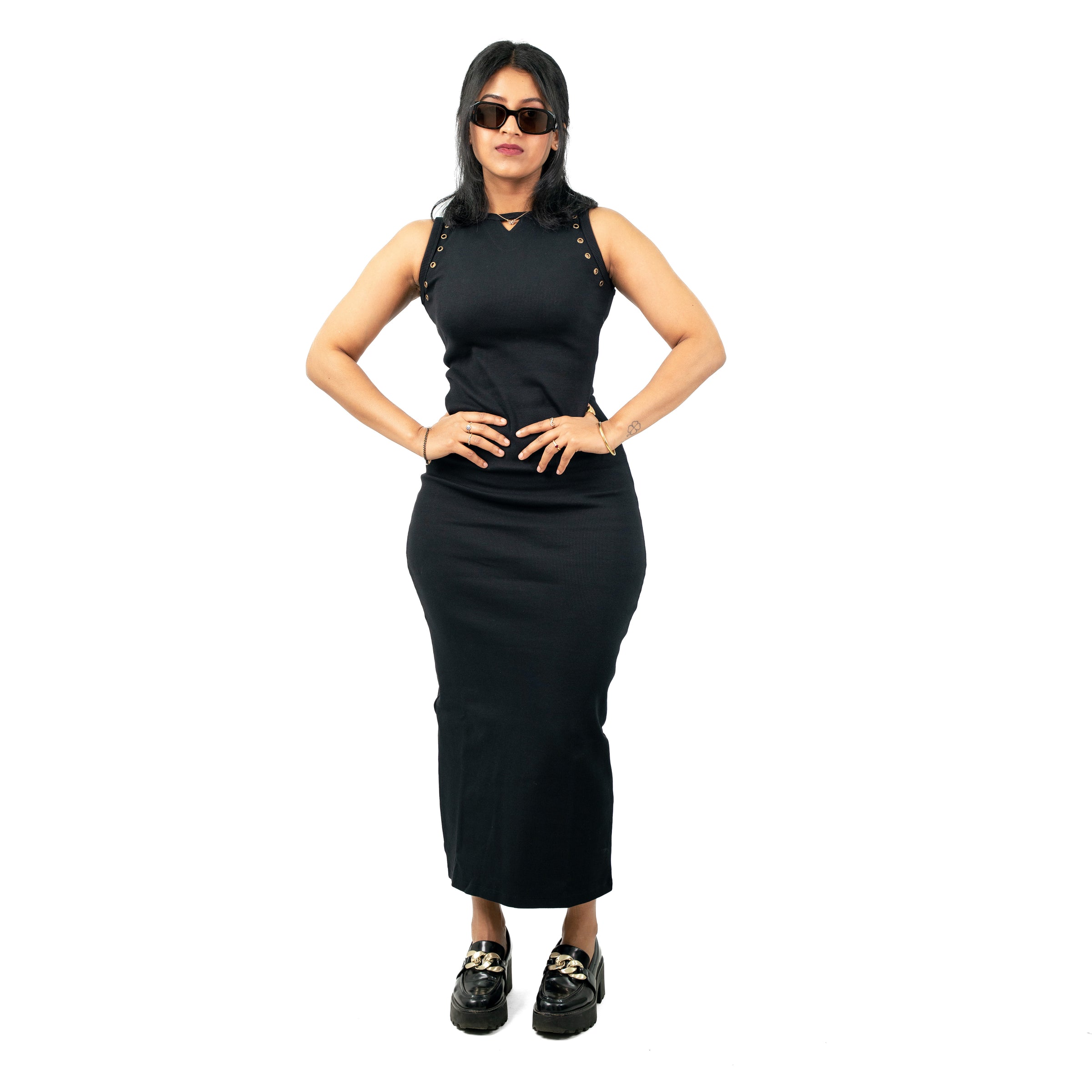 Standout features include grommet-adorned sleeves for a modern, eye-catching touch, a subtle V-shaped cutout at the front neckline for a hint of allure, and a back slit that adds both elegance and ease of movement. Whether you’re dressing up for a night out or keeping it effortlessly chic, this dress is a true wardrobe essential.